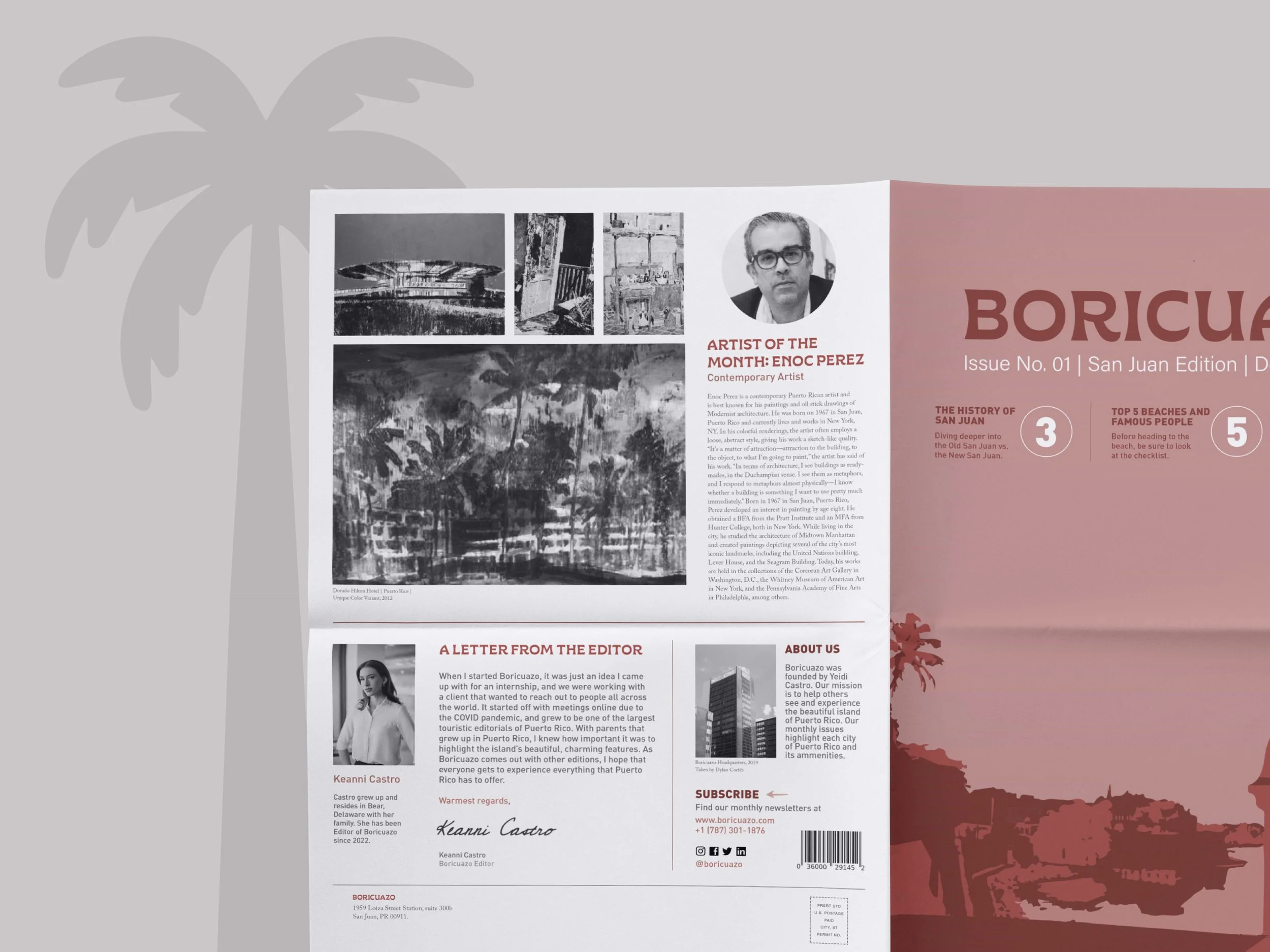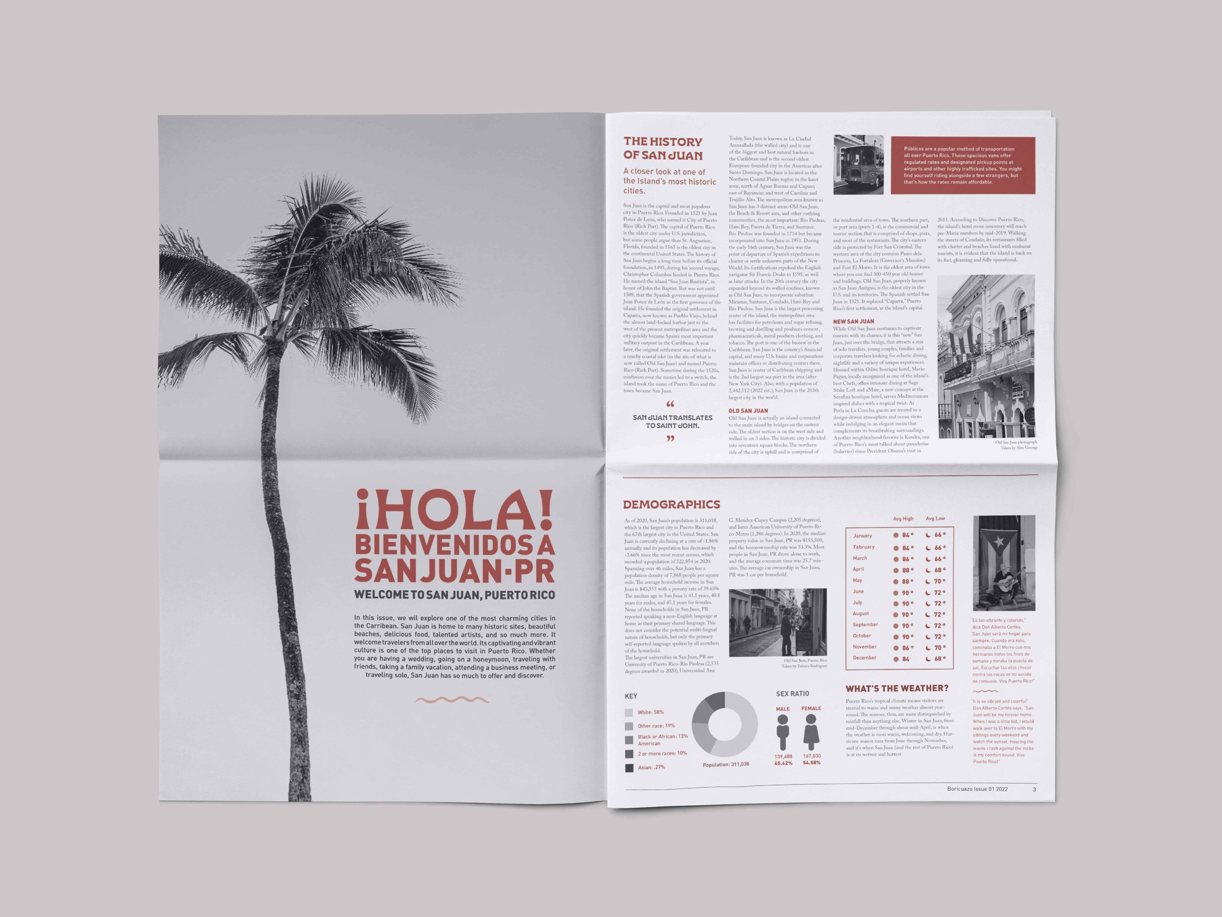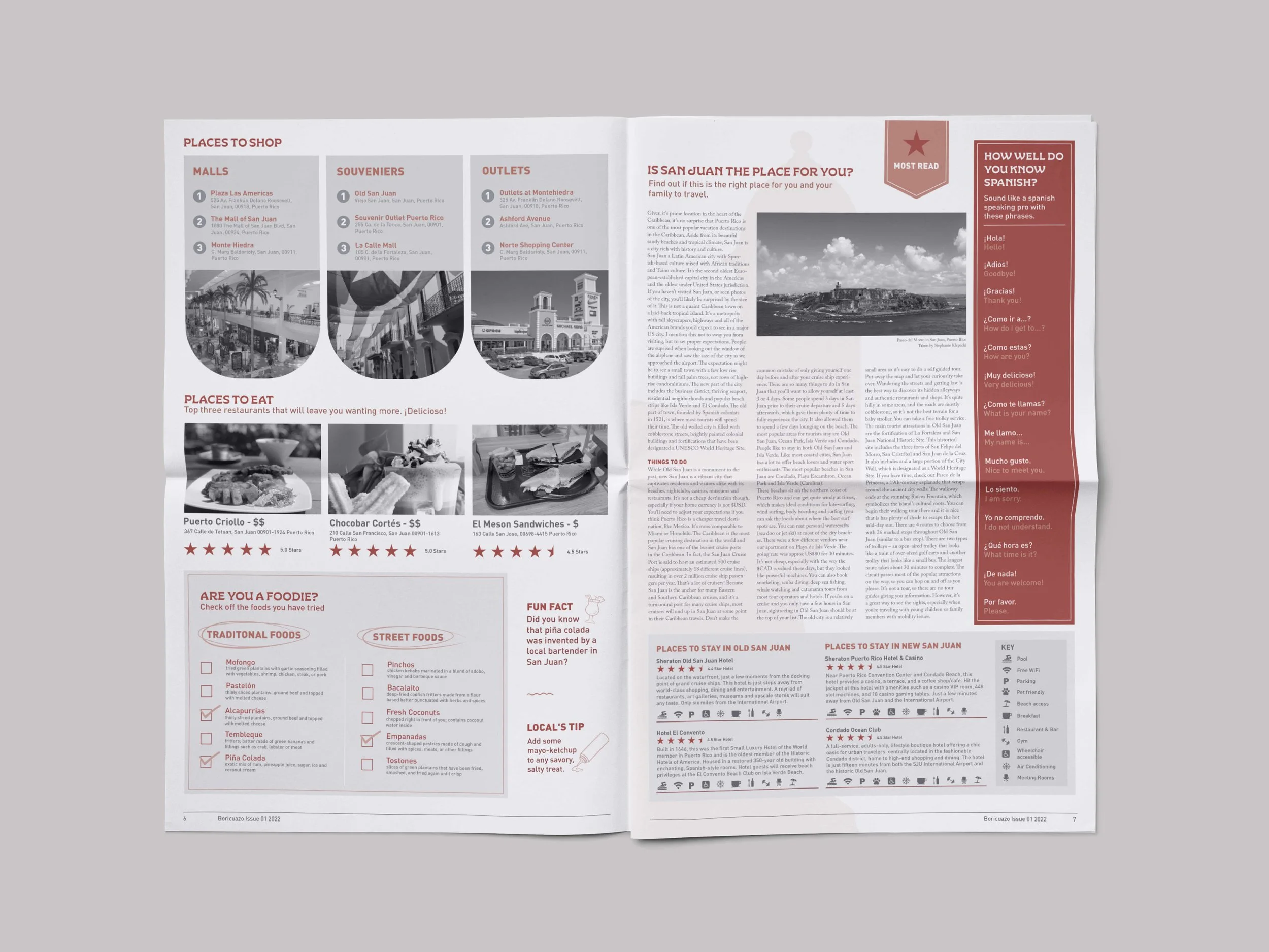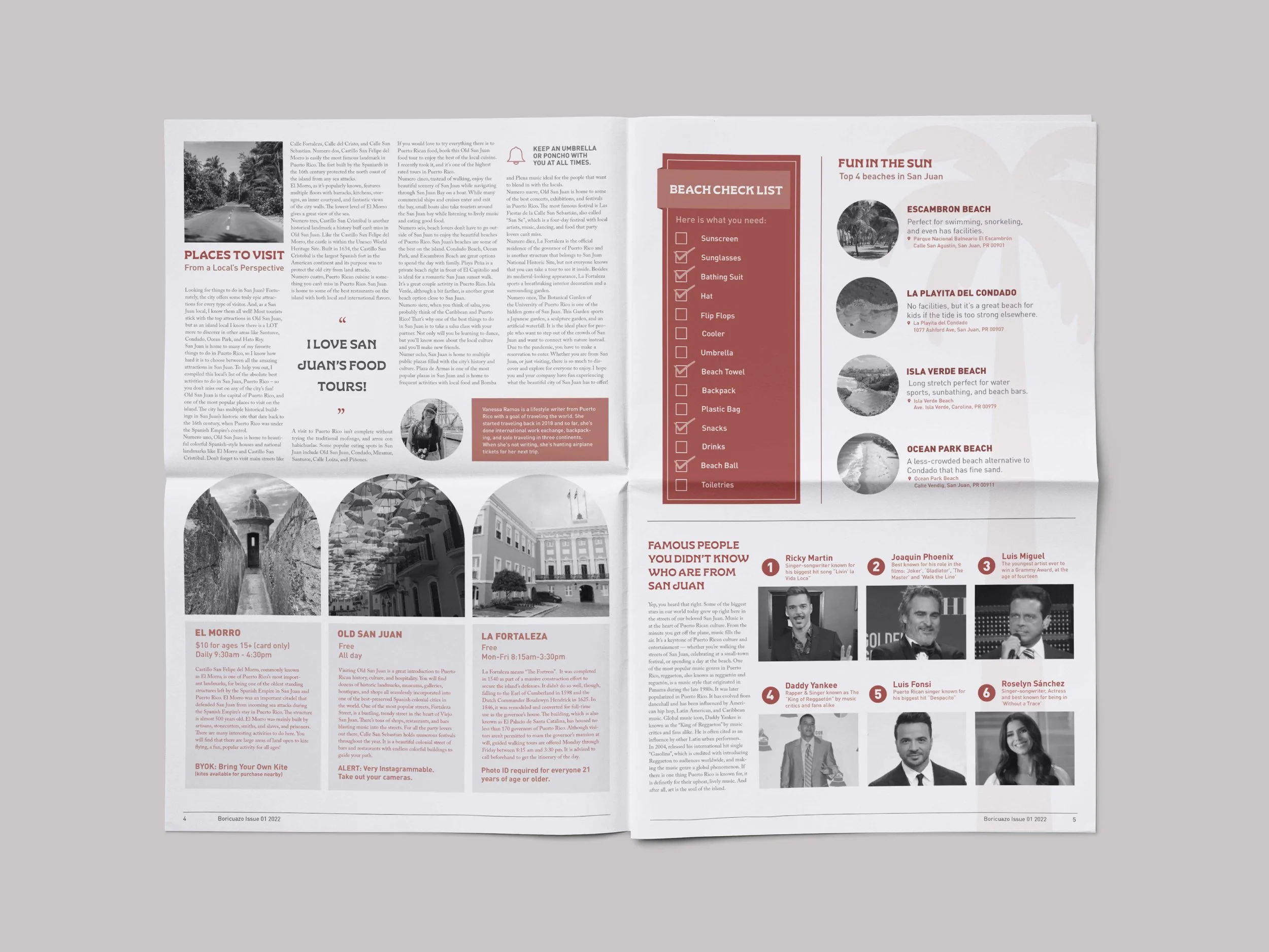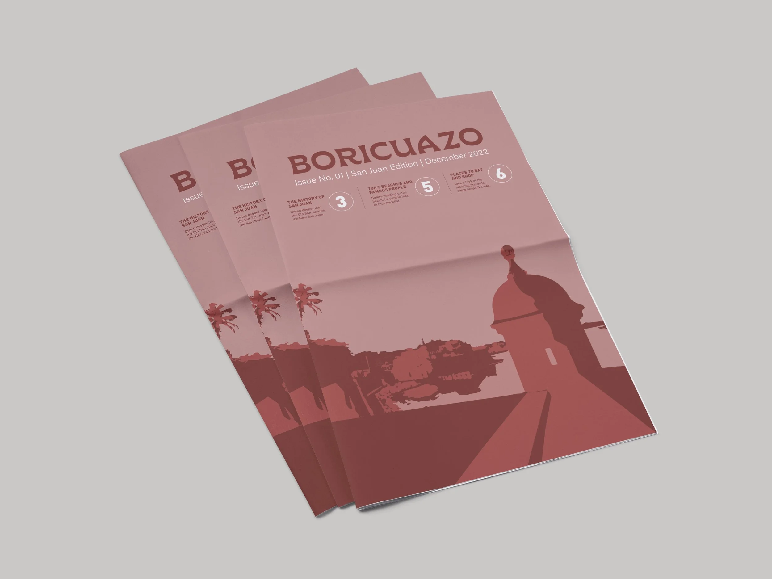 Boricuazo is a Puerto Rican based publication designed for tourists visiting cities in Puerto Rico. This month’s edition, focused on San Juan, highlights the island’s rich culture, history, and local experiences, offering insider tips, event guides, and travel information. With vibrant visuals, engaging design, and a focus on authentic local experiences, Boricuazo provides an immersive resource that celebrates Puerto Rico’s unique charm, connecting travelers to the heart of the island’s vibrant community and diverse attractions.