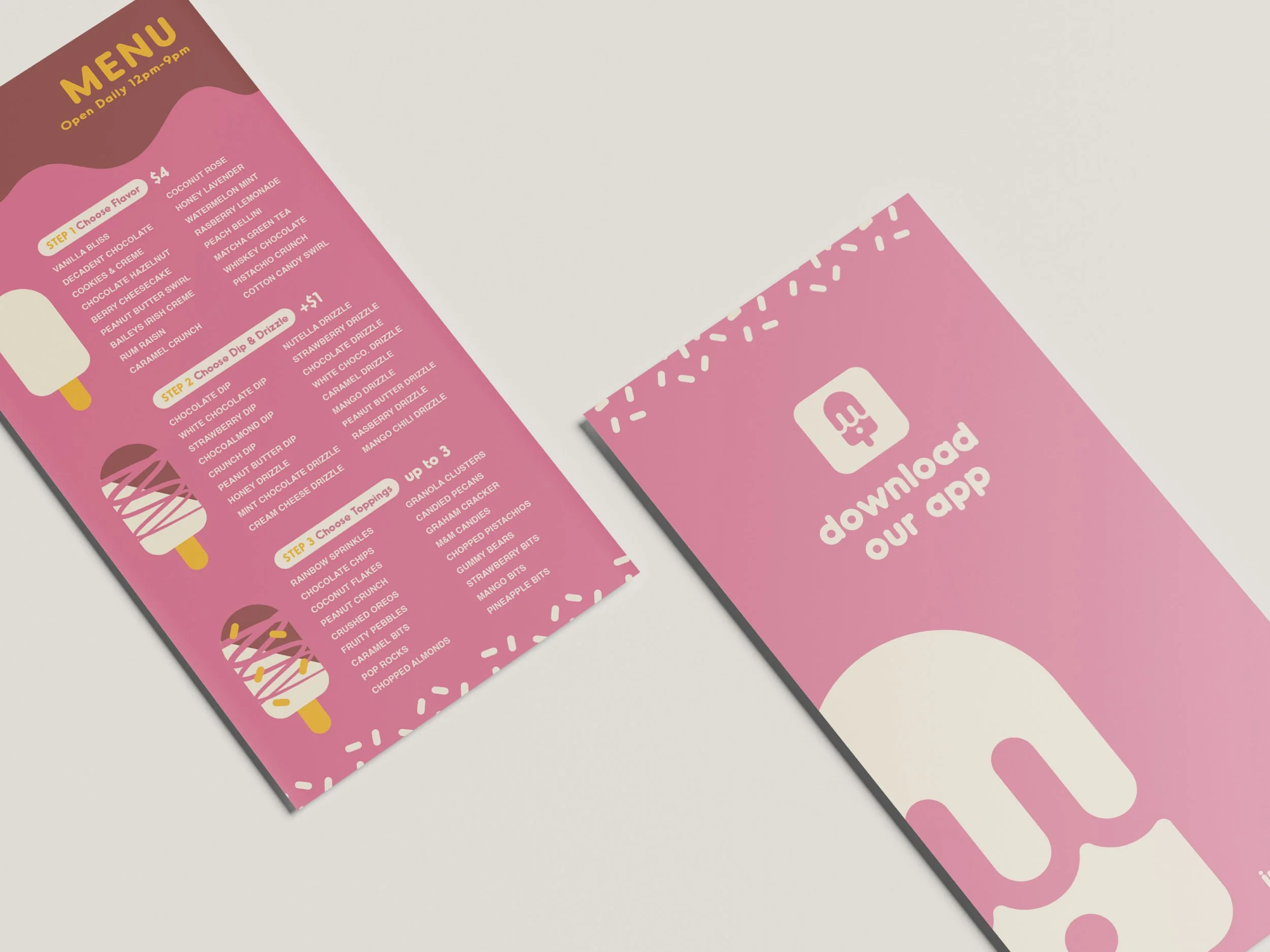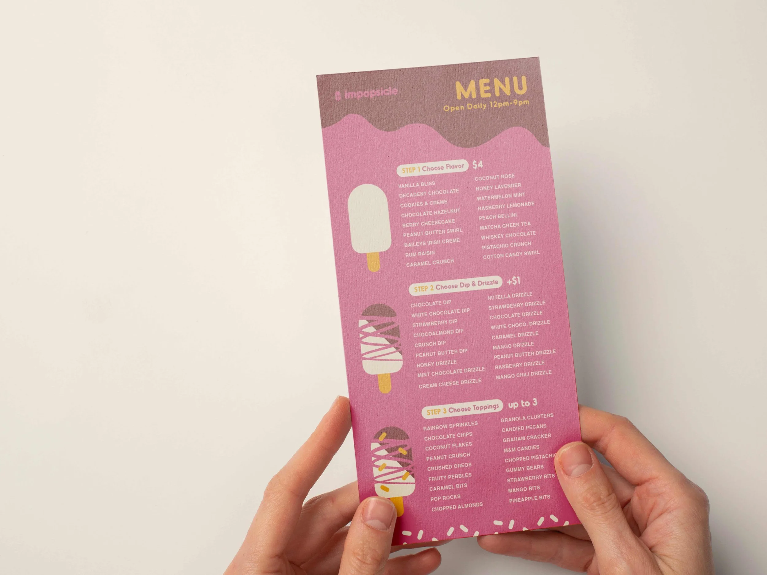 Impopsicle is an artisan popsicle food truck that brings the motto “No combination is impossible” to life with a highly customizable experience. Offering a wide range of unique flavors and toppings, there’s a popsicle for everyone to enjoy. With an intuitive app for online ordering, customers can easily personalize their popsicle and have it ready for pickup. Every design element reflects the playful and creative spirit of Impopsicle, making it a fun, diverse, and memorable experience for all.