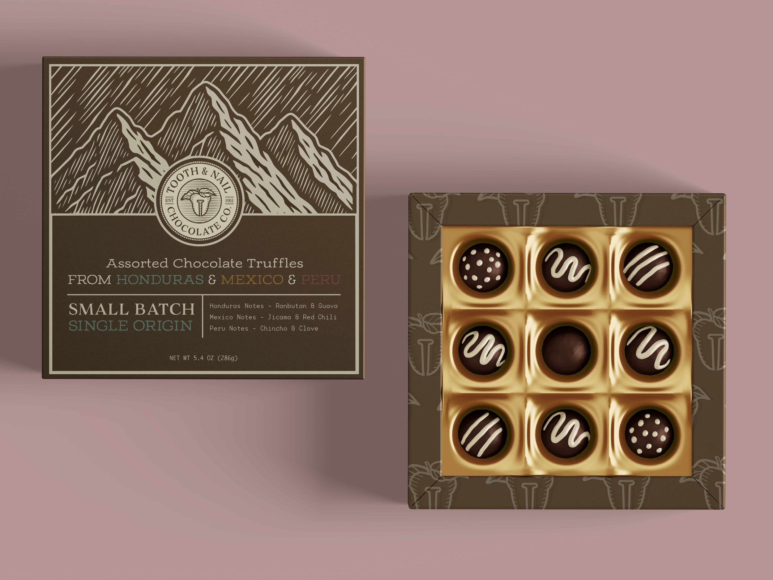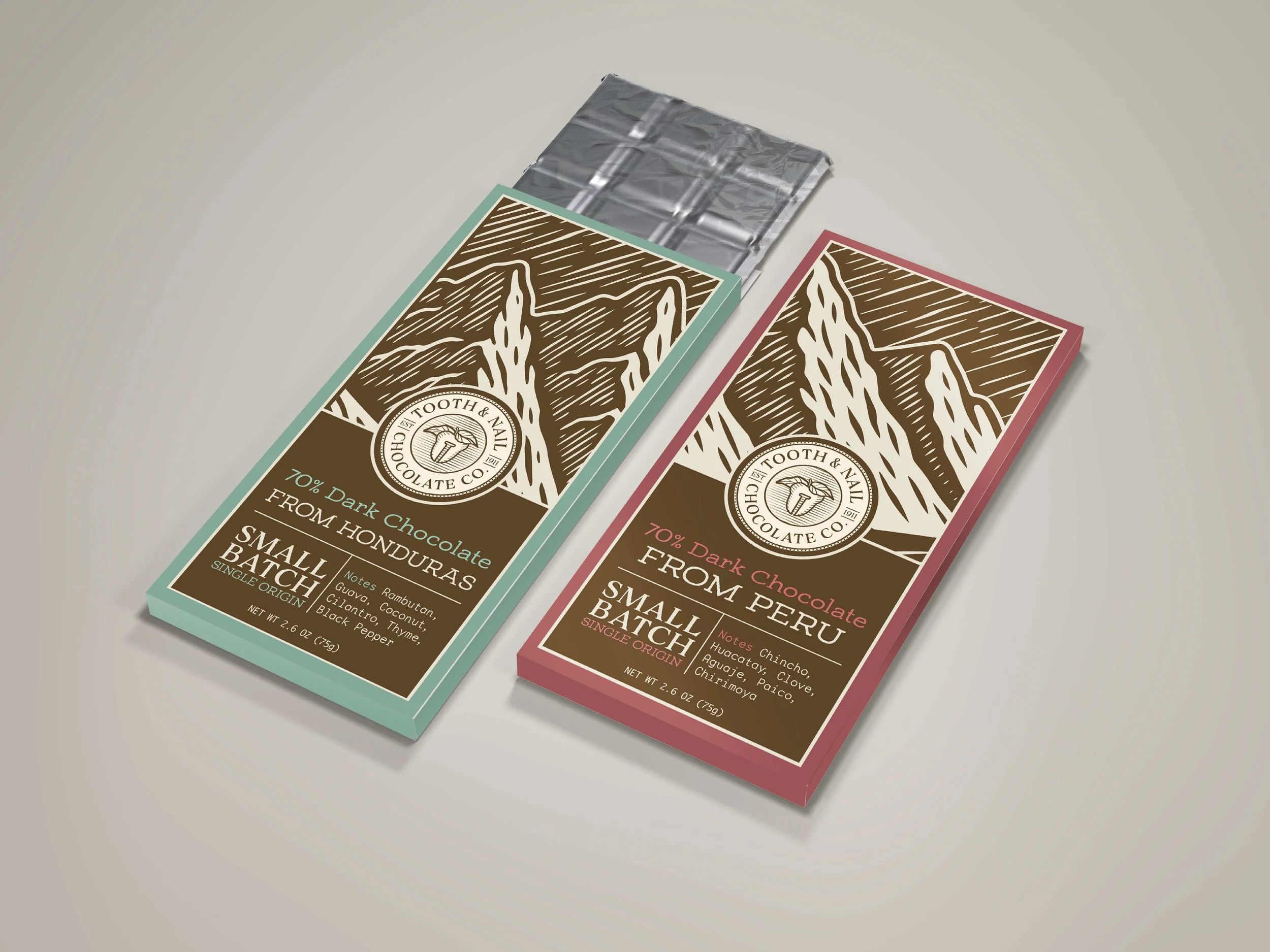 Tooth & Nail Chocolate Co. is a bold, globally inspired chocolate brand that celebrates rich cacao traditions from around the world. This project highlights origin bars sourced from Honduras, Peru, and Mexico, each crafted to showcase the unique flavor notes of their region. In addition to single-origin bars, Tooth & Nail offers a variety of assorted chocolates for adventurous palates, blending modern flair with deep-rooted heritage. The brand identity strikes a balance between grit and elegance, reflecting the hard work behind every handcrafted piece.